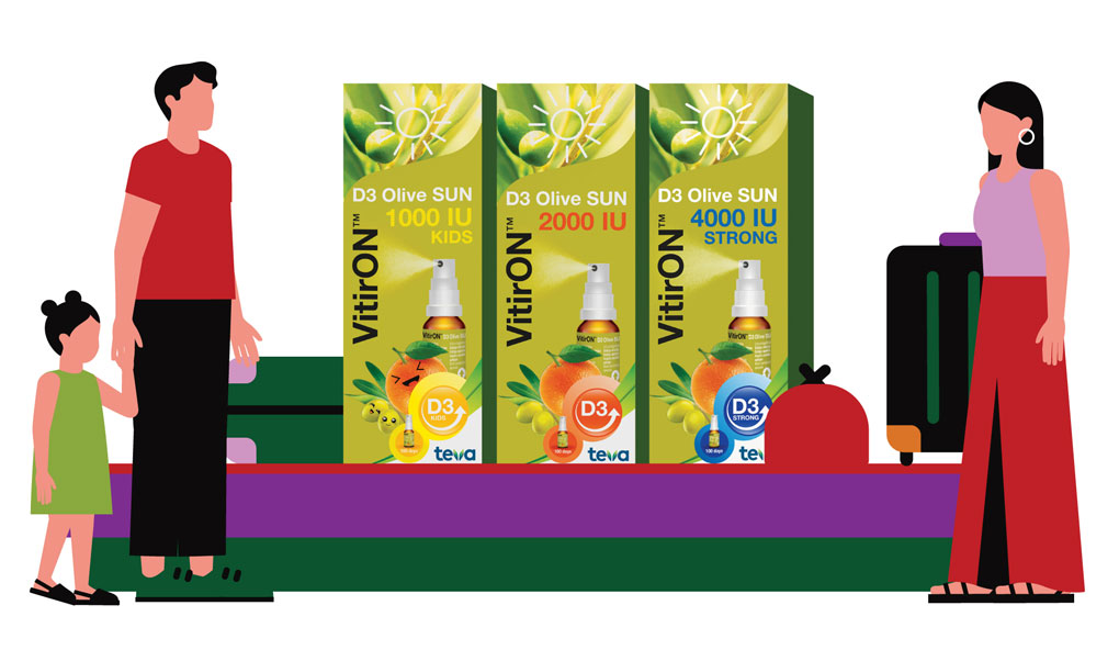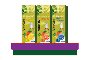 VitirON™ D3 Olive SUN 1000 RÜ: lastele vanuses 0-12 kuud 1 pihustus 1 kord päevas, 1-10 aastastele 1 pihustus 2 korda päevas, lapsed alates 11. eluaastast ja täiskasvanud, rinnaga last imetavad emad ja rasedatele 1 pihustus 4 korda päevas. Imikutele ja väikelastele võib anda lusikatäie piima või pudruga.